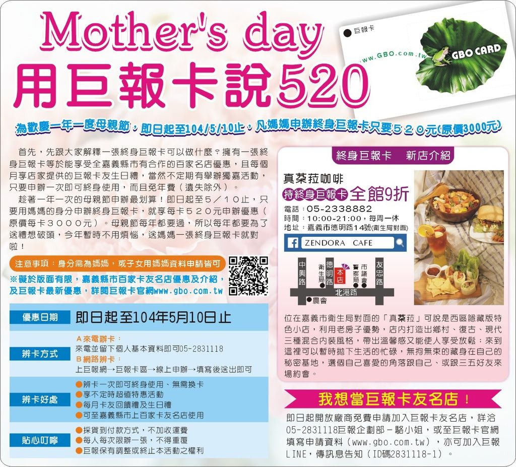 Mother’s day用巨報卡說520!(預購母親節蛋糕獨享8折、新卡友名店-真朵菈咖啡)