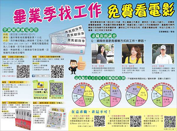 內容:用手機或電腦上網搜尋「巨報人力銀行」(www.gbo.com.tw),填寫完整履歷成為人力會員,即可參加抽獎
