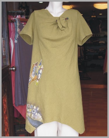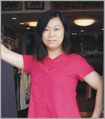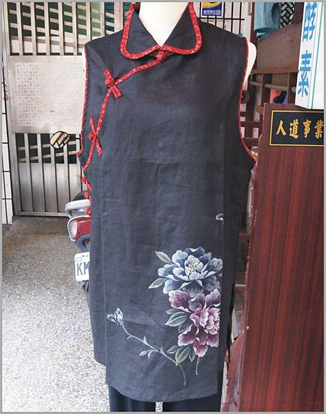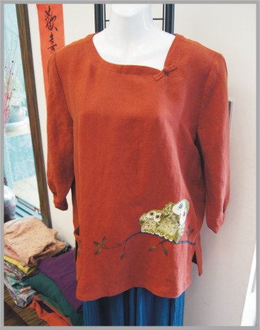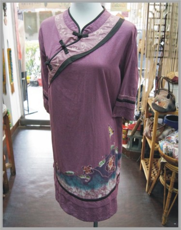 「翠妹妹手染服飾坊」的銀飾設計師江鳳玲小姐,求學時期便是唸美工系,因此培養出精細功夫!江鳳玲小姐推薦「中國風服飾」,由於先前後宮甄環傳在台播出,造成一股古裝服風潮,衣料以中國唐裝斜巾為基底,搭配手工蠟染,且使用事先繡好的緹花布,帶給人一股清宮服飾感。