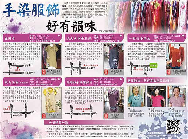 店名中,「飛鳥」代表很大的設計想像空間,「貓」則是自由創作,希望來店客人,可穿出優雅品味。手染服飾從打草稿、打版、美術、成衣製作,聘請專業團隊打造,展現獨特味道。「春夏風服飾」用手繪蠟染設計,結合現代卻又不失線條感。