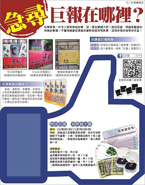 內容:按讚加入巨報臉書粉絲團,並於本活動圖檔下方留言,上傳「巨報報盒照片1張+說明拍照地點」,就能獲得抽獎機會,每人限投稿一次