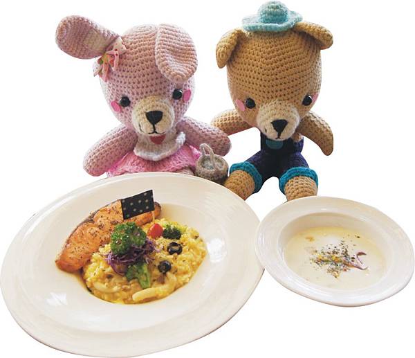 「熊與兔手作鄉村廚房」,店名取名熊與兔,是因為林店長姐姐曾在夢中夢見北歐森林中,出現一隻可愛小白兔及小熊奔跑嬉戲。另外,林店長推薦「鮭魚南瓜燉飯」,使用挪威進口的鮭魚,搭配夏季南瓜,不僅養生、開胃,很適合家庭聚餐來店內享用餐點。