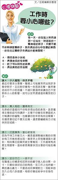 在職場上你總是恰如其份的嚴守做人的分際、分寸,只要扮演好自己的角色,在工作上也持續一貫的盡心盡力,不要造成同事間對立,或輕率的加入公司八卦話題,相信你會從紛爭中全身而退。