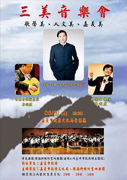內容:金鐘獎歌王殷正洋、金曲獎最佳古典音樂專輯獎方銘鍵、台中聞韶軒絲竹室內樂團聯手演出,帶來懷念老歌、民謠、西洋經典歌曲、著名古典吉他等名曲