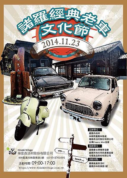 內容:台灣經典MINI協會主辦,有展出300多輛經典復古老車(如MINI、偉士牌、川崎等)、經典汽車紙模型親子著色比賽(現場報名、限額150名)、60年代汽車試乘體驗(如有興趣可現場詢問服務台),現場另有玩遊戲拿獎品