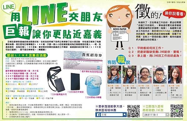 巨報怎麼會對嘉義的朋友那麼好啦!在粉友的呼喊下我們立馬舉辦了送大獎活動。你知道巨報除了有臉書粉絲團,現在更有巨報專屬的LINE喔!只要一個小小的按鍵就能成為巨報最親密的愛人……呃,我是說朋友。成為巨報LINE友後,會定期收到關於嘉義的工作職缺、省錢資訊或巨報卡訊(LINE友可自行選擇),是不是好棒棒呢~(轉圈圈)