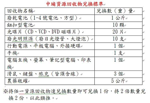 內容:憑廢乾電池、鈕扣型電池、光碟片、廢光明照源、行動電源、平板、滑鼠、手機、農藥瓶罐等任一資源回收物,達指定數量,可兌換白人牙膏、小包裝禾豐米、福壽麵、特級精鹽等民生用品,兌換種類有限,以現場數量為主