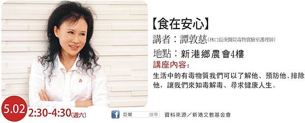 內容:毒物的可怕來自慢性累積,林口長庚醫院毒物實驗室護理師譚敦慈主講,延續已故丈夫俠醫林杰樑捍衛食品安全及衛教重擔,將分享生活中的有毒物質,教導如何了解它、預防它、排除它,一起知毒解毒,尋求健康人生