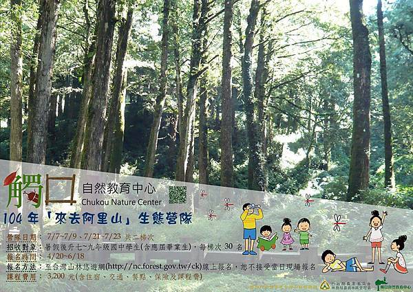 內容:課程有走訪生態教育館、漫步巨木群步道、賞阿里山五奇(日出、雲海、晚霞、森林巨木及鐵路)、賞鳥、觀星等,並化身森林調查隊,學習基礎林木調查技能,每梯次限額30名,限暑假後升國一至國三學生報名(含應屆畢業生),額滿為止
