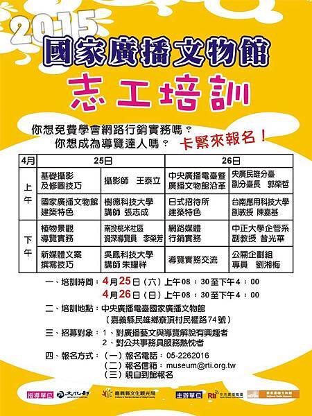 內容:基礎攝影及修圖技巧、國家廣播文物館建築特色、植物景觀導覽實務、新媒體文案撰寫技巧、中央廣播電臺暨廣播文物館沿革、網路媒體行銷實務等課程,歡迎對廣播藝文與導覽解說有興趣者報名