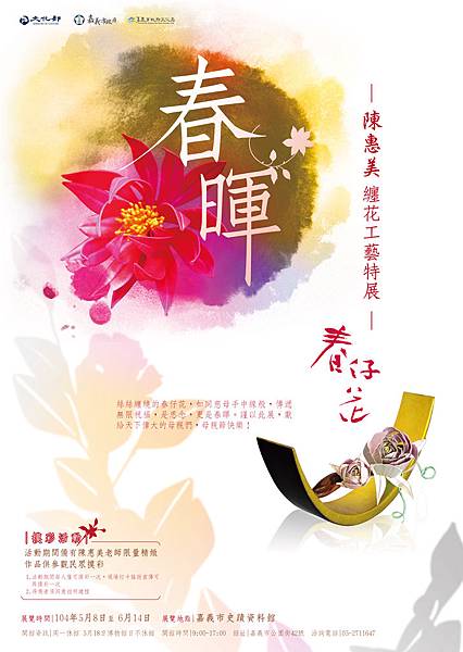 內容:宜蘭縣無形文化資產傳統工藝美術保存者暨台灣工藝之家「春仔花」工藝師陳惠美,展出纏花作品。絲絲纏繞的春仔花,如同慈母手中線般,傳遞無限祝福