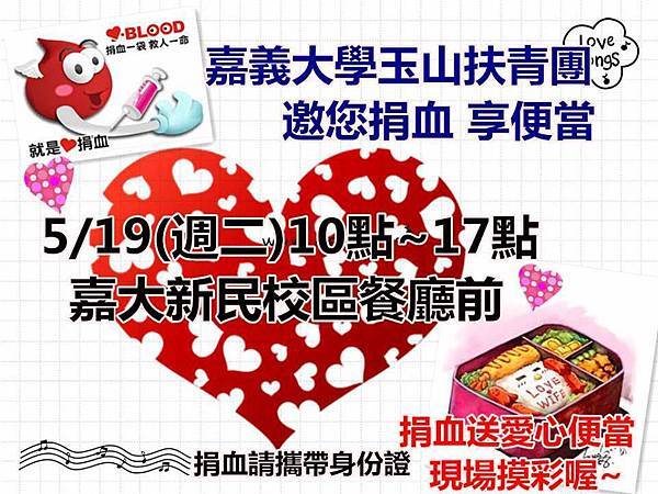 內容:捐血送愛心便當,且可參加摸彩。捐血前請勿熬夜(睡眠滿6小時),當日攜帶身分證或健保卡