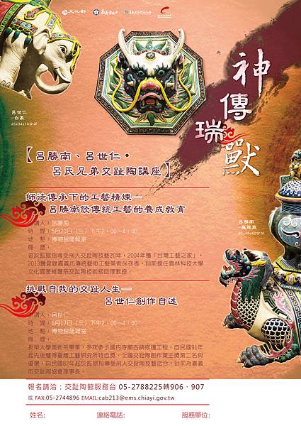 內容:5/20由交趾陶藝師呂勝南主講,講題為「師徒傳承下的工藝精煉—呂勝南談傳統工藝的養成教育」,6/17由交趾陶藝師呂世仁主講,講題為「挑戰自我的交趾人生一呂世仁創作自述」,報名至額滿止