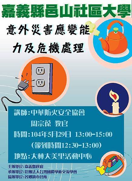內容:中華防火安全協會周宗葆教官主講,教導民眾面對意外災害時,該如何處理