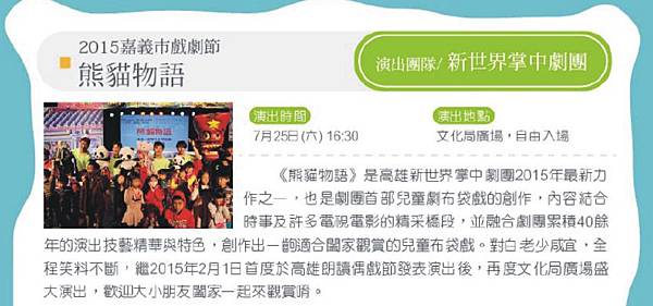 內容:新世界掌中劇團演出,兒童劇布袋戲,對白老少咸宜,全程笑料不斷,歡迎大小朋友一起來觀賞