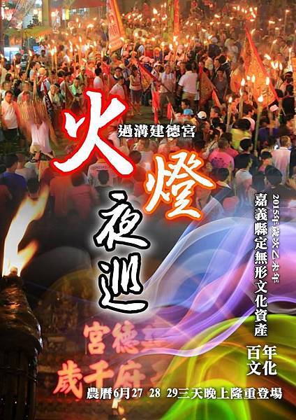 內容:「2015神鬼傳奇 平安在嘉」系列活動,每日14:30至16:00火燈免費DIY體驗,歡迎民眾踴躍參加,每日20:00至22:00火燈繞境,結束後可享用平安圓保平安。此外,另有泥沼抓鬼搶平安金、大輦體驗求平安、幸運冰棒擲筊送、禮好店家消費摸彩,詳閱備註