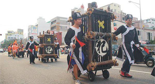 ↑ 由衙役押解的犯人,被關在囚車中隨著隊伍繞境。