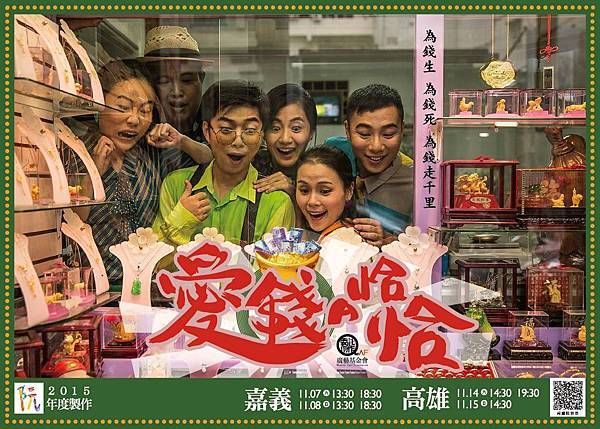 內容:阮劇團2015年度製作全新台語喜劇,《愛錢A恰恰》改編自法國喜劇泰斗莫里哀的《吝嗇鬼》,當控制狂與了尾仔子愛上同一人,勉強撐住的家,陷入金錢、愛情、權力階級鬥爭,這齣倫理親情大悲劇又會爆出多少笑料?