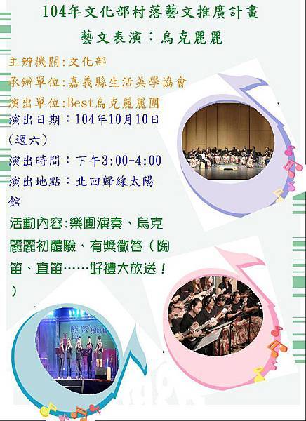 內容:文化部村落藝文推廣計畫,當日由Best烏克麗麗團演出,有樂團演奏、烏克麗麗初體驗、有獎徵答,陶笛、直笛等好禮大放送