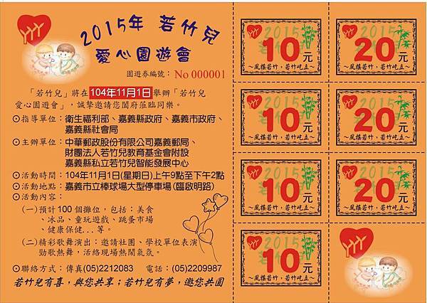 內容:籌建若竹兒永久家園第二期工程,當日預計有100個愛心攤位,包含美食、冰品、童玩、跳蚤市場等,另邀請社團、學校攤位表演勁歌熱舞,歡迎民眾事先購買園遊券,當日可於現場攤位使用
