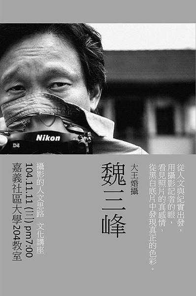 內容:邀請大王婚攝魏三峰主講,從人文與紀實出發,用攝影記者的眼,看見照片的真感情,從黑白底片中發現真正的色彩