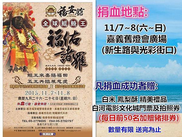 內容:配合「全球鯤鯓王 福佑諸羅」活動,捐血成功贈白米、鳳梨酥、精美禮品、白河電影文化城門票及拍照券,每日前50名捐血者加贈豬排券,數量有限,送完為止