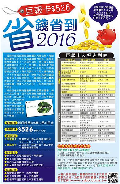 每到年底就能感受到什麼叫光陰似箭,再兩個多禮拜2015年就要離我們而去,緊接著就是要迎接2016年的到來,為了讓巨報讀者省錢省到2016,即日起,終身巨報卡開放讀者申辦,凡於104年12月31日前申辦終身巨報卡,每卡只要526元,擁有我愛2016年到來的意思!申辦一次就讓你省錢一輩子的「終身巨報卡」,要給你經濟又實惠的好用途,現在立刻申辦即享有526元辦卡超值優惠(原價3000元),只要立即辦就立即省!