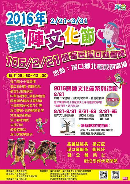 內容:以「跟著愛溪口遊藝陣」為主題,舉辦創意DIY、溪口好物市集、童趣在藝陣、元宵遶境祈福、藝陣慶元宵攝影比賽、歷年藝陣文化節回顧展等活動