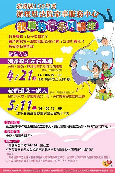 內容:離婚了,孩子怎麼辦?將邀請專家分享離婚後,父母如何讓孩子感受到愛。4/21別讓孩子左右為難,邀請邱信凱心理師主講;5/11我們還是一家人,邱怡薇專科社工師主講,歡迎面臨家事事件或正在訴訟的當事人,或對議題有興趣的民眾報名,每場次20名