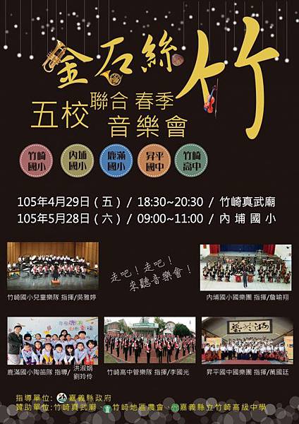 內容:竹崎國小兒童樂隊、內埔國小樂團、鹿滿國小陶笛隊、昇平國中國樂團、竹崎高中管樂隊聯合演出,歡迎一起來聽音樂會