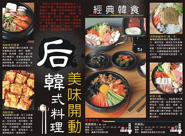 感受王后般賓至如歸的款待,「后韓式料理」將宮廷美食與現代飲食融合,激盪出經典韓食美味,無論是石鍋拌飯、鍋類、火鍋類、烤肉類主餐,或年糕、煎餅、炒類、小菜等單品,都用心料理,新鮮食材、現點現做,加上高挑沉穩黑色系裝潢,價位親民,造就「后韓式料理」一道道經典韓食美味。