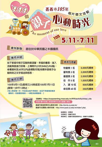內容:拍下家庭親子互動時最溫馨、幸福的畫面,進入活動頁面進行投稿。上傳照片、參賽資料及30字以內有關親子心動時刻之文字描述與感言。經縣市初賽、全國決賽後,最高可獲得5000元等值商品或禮券,全國特優另贈iPad Air2