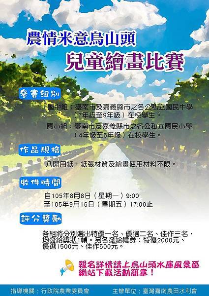 內容:限就讀台南市及嘉義縣市各公私立國中、國小四年級至六年級參加,以「烏山頭水庫暨嘉南大圳」為主題,水利建設、田野景觀、農村風情等相關主題皆可自由發揮,分國中組、國小組,各組最高可獲禮券2000元,並公開展覽一個月