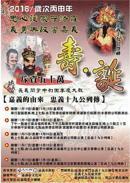 內容:慶祝丙申年主神忠義十九公聖誕千秋,邀請寶麗歌仔戲或長義閣掌中劇團演出《嘉義的由來 忠義十九公列傳》,斥資五十萬打造長24尺大型劇場舞台,歡迎民眾前來欣賞有著在地歷史與人文典故的掌中劇