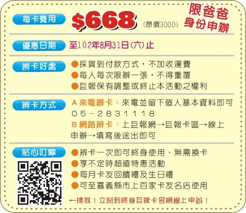 即起日至102年8月31日(六)止,申辦終身巨報卡即享有嘉義縣市百家巨報卡友名店消費折扣,每個月還有巨報卡友回饋日及生日禮,也會不定時超值優惠活動喔!原價每卡三千元的終身巨報卡,現在只要668元,申辦一次就可使用一輩子,申辦後,無需任何理由皆可免費以舊換新(遺失除外),再也找不到一個這麼好的禮物,幫爸爸省錢一輩子了!