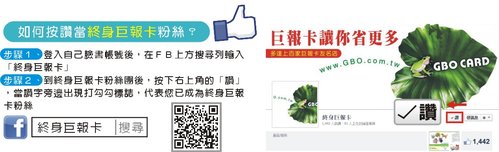 ★更多巨報卡即時優惠訊息,歡迎按讚加入「終身巨報卡」臉書: