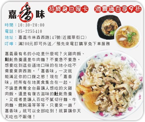 嘉義最有名的小吃是什麼呢?火雞肉飯、土魠魚羹還是牛肉麵?不要急不要急,想要吃到這些道地口味的在地小吃不需要東奔西跑,「嘉香味」一次就能滿足你的口腹之慾!現在「嘉香味」把所有在地美食集合在一起,不論是勇奪全台最讓人想吃的火雞肉飯,還是有復古滋味的土魠魚羹,又或者是讓人百吃不膩切仔麵、牛肉麵、餛飩湯等等等,只要來一趟「嘉香味」就可以全部吃到!就算讓你天天吃也不厭倦!