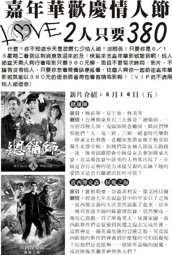 什麼?你不知道今天是農曆七夕情人節?沒關係!只要你是8/13星期二看到這則消息就還來的及!快點來去嘉年華影城報到啊!情人節當天兩人同行看電影只要380元柳,而且不限場次時間、影片,不論有沒有情人,只要你想看愛看隨便亂看,找個人與你一起前往嘉年華影城就能以380元的優惠價省荷包看首輪電影喔!(VIP廳不適用情人節優惠)