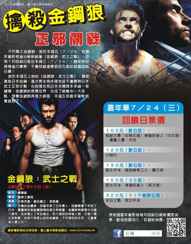 不朽戰士金鋼狼,將於本週五(7/26)在嘉年華影城推出最新續集《金鋼狼:武士之戰》,還有7月回饋日就在本週三(7/24),趕快把日期寫進行事曆,千萬別錯過票價百元起的超值回饋日嘿!