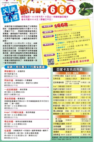 即日起至102年8月10日止,申辦終身巨報卡每卡只要668元(原價三千元)