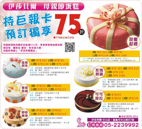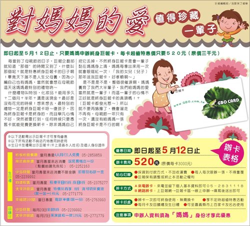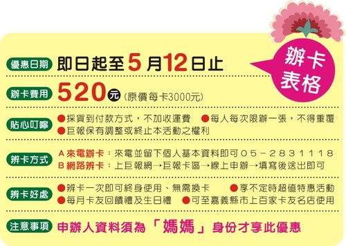 即日起至5月12日止,只要媽媽申辦終身巨報卡,每卡超值特惠價只要520元(原價三千元)