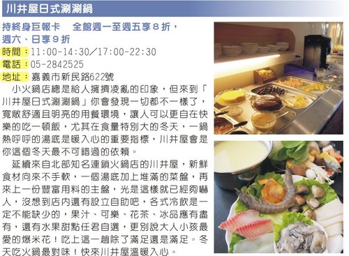 小火鍋店總是給人擁擠凌亂的印象,但來到「川井屋日式涮涮鍋」你會發現一切都不一樣了,寬敞舒適且明亮的用餐環境,讓人可以更自在快樂的吃一頓飯,尤其在食量特別大的冬天,一鍋熱呼呼的湯底是暖入心的重要指標,川井屋會是你這個冬天最不可錯過的依賴。