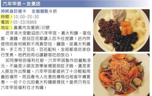 近年來大受歡迎的六年甲班,義大利麵、蛋包飯、湯麵、甜品豆花都讓人忍不住按讚!店內所使用的食材絕對不用真空包、罐頭,從義大利醬料、手工布丁豆花、豆花配料,全部都是店家自行烹煮,他們的用心讓顧客吃的放心!