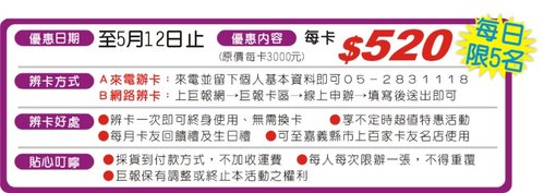 請不要再懷疑了,到5月12日前,巨報卡真的只要520元,攏係為著母親節啦,看在媽媽的面子上,巨報卡今年只有這波檔期最低價,錯過就真的沒有了,企劃小編拍胸脯保證(都快拍到內出血了)所以請大家把握機會啊!