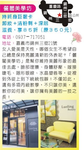 女人愛美是天性,哪個女生不希望自己總是保持亮麗清新的外表呢?「儷閣美學坊」是幫你維持美麗形象的最佳去處,臉部理療、身體舒壓、嫁接睫毛、隱形眼線、水晶塑唇等,從裡到外從上到下統統包辦!不僅如此,還有多項丙級教學,不只讓你美,還教你如何美,讓你擁有美麗的一技之長!