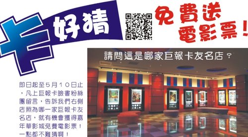 即日起至5月5日止,凡上巨報卡臉書粉絲團留言,告訴我們上方店照為哪一家巨報卡友名店,就有機會獲得嘉年華影城免費電影票!一點都不難猜啊!