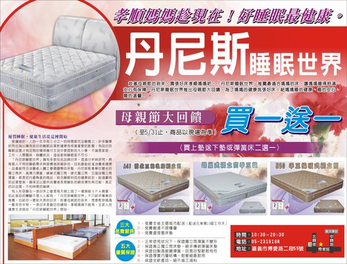 趁著母親節的到來,買張好床孝順媽媽吧,「丹尼斯睡眠世界」推薦最適合媽媽的床,讓媽媽睡得舒適、安心有保障!丹尼斯睡眠世界推出母親節大回饋,為了媽媽的健康挑張好床!