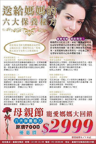 媽媽們平日忙於工作、家庭,蠟燭兩頭燒常忘記好好照顧自己的身體及美麗,在這專屬於女性的母親節,除了獻上無限感恩及祝福外,更要提醒每個女性朋友,在忙碌之餘一定要好好愛惜自己的身體跟美麗!