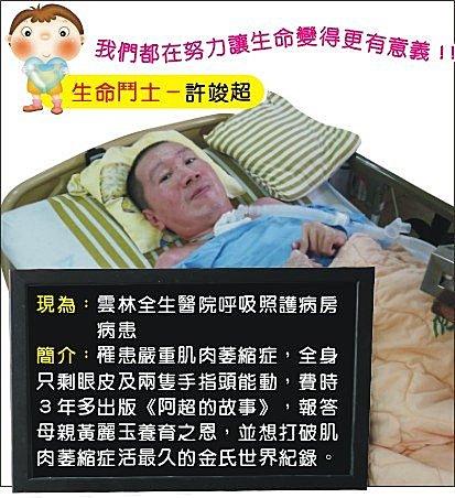 簡介:罹患嚴重肌肉萎縮症,全身只剩眼皮及兩隻手指頭能動,費時3年多出版《阿超的故事》,報答母親黃麗玉養育之恩,並想打破肌肉萎縮症活最久的金氏世界紀錄。