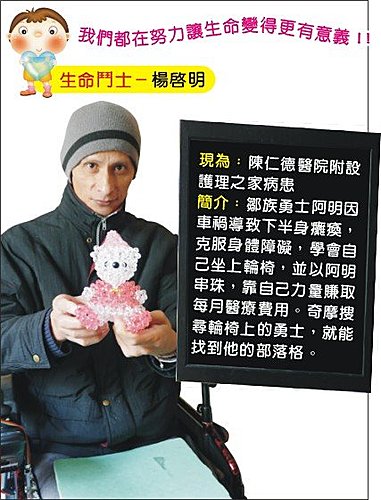 簡介:鄒族勇士阿明因車禍導致下半身癱瘓,克服身體障礙,學會自己坐上輪椅,並以阿明串珠,靠自己力量賺取每月醫療費用。奇摩搜尋輪椅上的勇士,就能找到他的部落格。